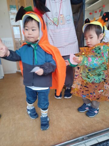 👻姉妹園の子ども達が、仮装をして遊びに来てくれました。「トリックオアトリート❕」と声にしていましたよ。お互いに仮装を観察したりプレゼントを渡して、交流しました。