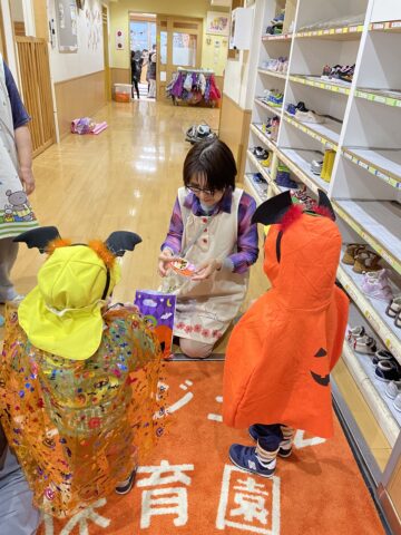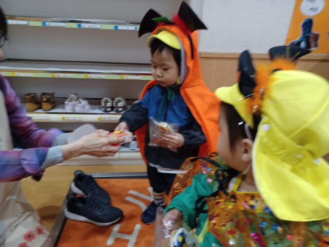 👻エンジェル保育園では、園長先生が迎えてくださり、お菓子とジュースをプレゼントして頂きました。大事そうに抱え喜んでいましたよ。