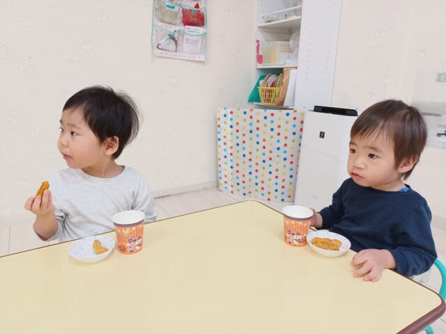 👻午後のおやつは「かぼちゃのチュロス」でした。かわいいコップに牛乳が注がれていたので、喜んで飲んでいました。美味しくいただきましたよ。給食さんありがとう❣